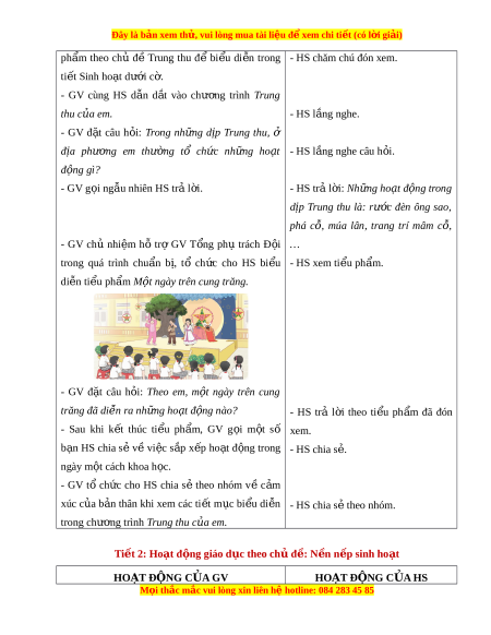 ụ tiêu: HS tham gia ho t ạ đ n ộ g Trung thu c a ủ em theo k ế ho ch ạ c a ủ nhà tr n ườ g. b. Cách ti n ế hành - GV cử m t ộ số b n ạ x p ế ghế theo hàng l i ố và - HS tham gia v i ớ sự phân công c a ủ ngồi đúng ch ỗ c a ủ l p ớ mình. GV. - GV T n ổ g phụ trách yêu c u ầ đ i ộ văn nghệ c a ủ - HS chu n ẩ b ịti t ế m c. ụ tr n ườ g chu n ẩ bị ti u ể ph m ẩ M t ộ ngày trên cung trăng. - GV khuy n ế khích m i ỗ l p ớ chu n ẩ bị m t ộ ti u ể M i