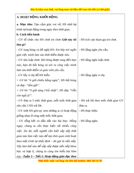 ệ đ xe ể m chi ti t (c ế ó lời gi i ả ) A. HOẠT ĐỘNG KH I Ở Đ N Ộ G a. M c ụ tiêu: T o ạ c m ả giác vui v , ẻ HS nhớ l i ạ trình t ự ho t ạ đ n ộ g trong ngày theo th i ờ gian. b. Cách ti n ế hành - GV tổ ch c ứ cho HS ch i ơ trò ch i