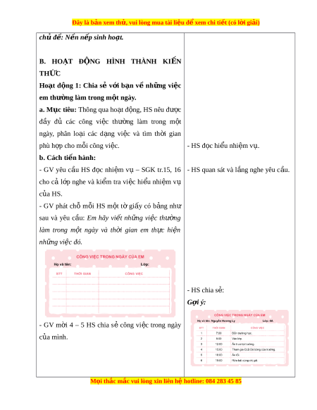 ậ ”, HS đáp “V n ẫ còn ng ủ !”. ạ - GV đ a ư ra 5 m c ố th i ờ gian, m i ỗ m c ố th i ờ gian - HS trả l i ờ theo m c ố th i ờ gian GV yêu c u ầ 5 HS tr ả l i ờ . đ a ư ra. - GV m i ờ HS giơ tay xem nh n ữ g ai có ho t ạ đ n ộ g - HS th c ự hi n ệ . giống nhau ở cùng m t ộ m c ố th i ờ gian. - GV t n ổ g k t ế và d n ẫ d t ắ vào bài h c ọ : H n ằ g - HS l n ắ g nghe. ngày, chúng ta c n ầ th c ự hi n ệ r t ấ nhi u ề công vi c ệ . Do đó, m i ỗ ng i ườ c n ầ bi t ế s p ắ x p ế th i ờ gian nào làm vi c ệ nào đ ể t o