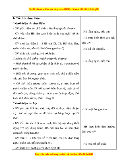 b. T ổ ch c ứ th c ự hi n ệ * Gi i ớ thi u ệ tên ch ủ đi m ể - GV gi i ớ thi u ệ tên ch ủ đi m ể : M n ả h ghép yêu th n ươ g. - HS l n ắ g nghe, ti p ế thu. - GV yêu c u ầ HS nêu cách hi u ể ho c ặ suy nghĩ về tên ch ủ đi m. ể - HS th c ự hi n ệ theo yêu c u ầ - GV m i ờ đ i ạ di n ệ 2 – 3 HS trả l i ờ . Các HS khác l n ắ g c a ủ GV. nghe, nh n ậ xét, nêu ý ki n ế b ổ sung (n u ế có). - HS trả l i ờ câu h i ỏ . - GV nh n ậ xét, đánh giá và k t ế lu n ậ : Ý nghĩa tên ch ủ đi m ể –m n ả h ghép yêu th n ươ g: - HS l n ắ g nghe, ti p ế thu. + Hình thành ở HS các ph m ẩ ch t