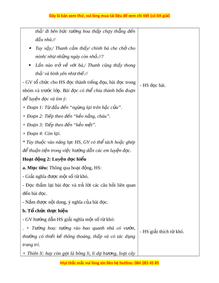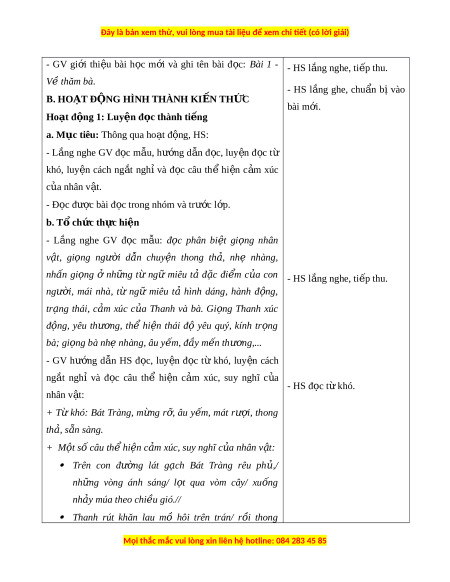 ụ tiêu: Thông qua ho t ạ đ n ộ g, HS: - L n ắ g nghe GV đ c ọ m u ẫ , h n ướ g d n ẫ đ c, ọ luy n ệ đ c ọ từ khó, luy n ệ cách ng t ắ nghỉ và đ c ọ câu th ể hi n ệ c m ả xúc c a ủ nhân v t ậ . - Đ c ọ đ c ượ bài đ c ọ trong nhóm và tr c ướ l p ớ . b. T ổ ch c ứ th c ự hi n ệ - L n ắ g nghe GV đ c ọ m u ẫ : đ c ọ phân bi t ệ gi n ọ g nhân v t ậ , gi n ọ g ng i ườ d n ẫ chuy n ệ thong th , ả nhẹ nhàng, nh n ấ gi n ọ g ở nh n