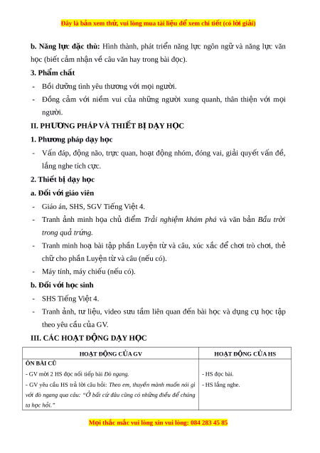 ề câu văn hay trong bài đ c) ọ . 3. Phẩm ch t ấ - Bồi dư ng ỡ tình yêu thư ng ơ v i ớ m i ọ ngư i ờ . - Đồng c m ả v i ớ niềm vui c a ủ nh ng ữ ngư i ờ xung quanh, thân thi n ệ v i ớ m i ọ ngư i ờ . II. PHƯ N Ơ G PHÁP VÀ THI T Ế B D Ị Y Ạ H C Ọ 1. Phư ng ơ pháp d y h ạ c ọ - Vấn đáp, đ ng ộ não, tr c ự quan, ho t ạ đ ng ộ nhóm, đóng vai, gi i ả quy t ế v n ấ đ , ề l ng ắ nghe tích c c. ự 2. Thi t ế b d ị y h ạ c ọ a. Đ i ố v i ớ giáo viên - Giáo án, SHS, SGV Ti ng ế Vi t ệ 4. - Tranh nh ả minh h a ọ chủ đi m ể Tr i ả nghi m
