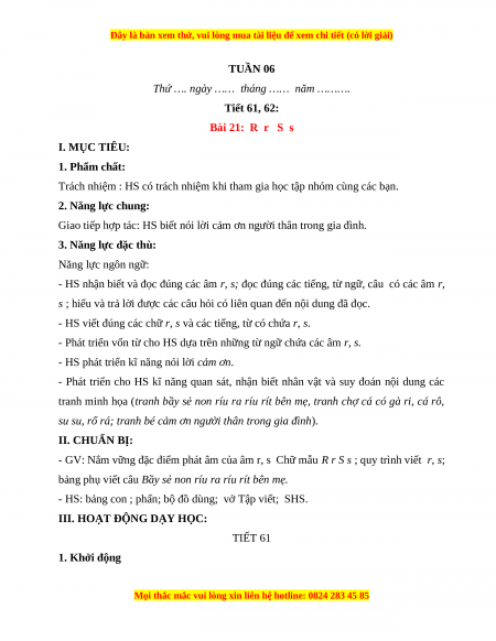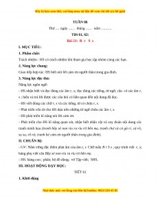 Thứ …. ngày …… tháng …… năm ………. Tiết 61, 62: Bài 21: R r S s I. MỤC TIÊU: 1. Phẩm chất: