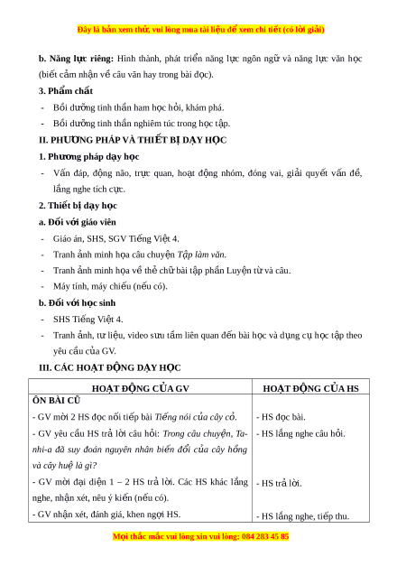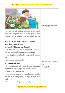 II. PHƯƠNG PHÁP VÀ THI T Ế BỊ DẠY H C Ọ 1. Phư ng ơ pháp d y ạ h c ọ - Vấn đáp, đ n ộ g não, tr c ự quan, ho t ạ đ n ộ g nhóm, đóng vai, gi i ả quy t ế v n ấ đ , ề l n ắ g nghe tích c c. ự 2. Thi t ế b ị d y ạ h c ọ a. Đ i ố v i ớ giáo viên - Giáo án, SHS, SGV Ti n ế g Vi t ệ 4. - Tranh n ả h minh h a ọ câu chuy n ệ T p ậ làm văn. - Tranh n ả h minh h a ọ v ề th ẻ ch ữ bài t p ậ ph n ầ Luy n ệ t ừ và câu. - Máy tính, máy chi u ế (n u ế có). b. Đ i ố v i ớ h c ọ sinh - SHS Ti n ế g Vi t ệ 4. - Tranh n ả h, tư li u ệ , video s u ư t m ầ liên quan đ n ế bài h c ọ và d n ụ g c ụ h c ọ t p ậ theo yêu c u ầ c a ủ GV. III. CÁC HO T Ạ Đ N Ộ G D Y Ạ H C Ọ HO T Ạ ĐỘNG C A Ủ GV HOẠT ĐỘNG C A Ủ HS ÔN BÀI CŨ - GV m i ờ 2 HS đ c ọ n i ố ti p ế bài Ti n ế g nói c a ủ cây cỏ. - HS đ c ọ bài. - GV yêu c u ầ HS trả l i ờ câu h i ỏ : Trong câu chuy n ệ , Ta- - HS l n ắ g nghe câu h i ỏ .