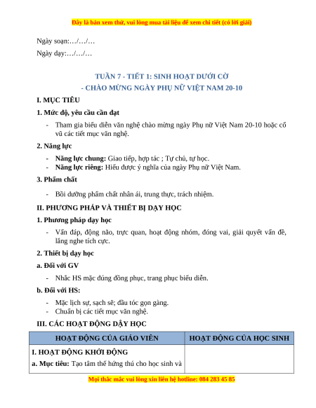 a. Mục tiêu: HS tham gia chào mừng ngày Phụ nữ Việt Nam 20-10. b. Cách tiến hành: - HS chào cờ.