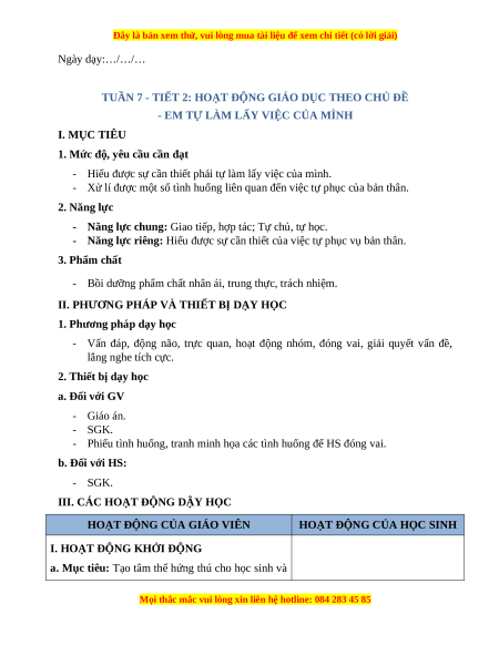 - Năng lực riêng: Hiểu được sự cần thiết của việc tự phục vụ bản thân. 3. Phẩm chất
