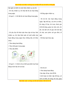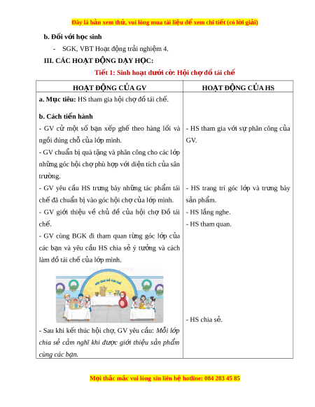 ệ đ xe ể m chi ti t (c ế ó lời gi i ả ) b. Đ i ố v i ớ h c ọ sinh - SGK, VBT Ho t ạ đ n ộ g tr i ả nghi m ệ 4. III. CÁC HO T Ạ Đ N Ộ G DẠY H C Ọ : Tiết 1: Sinh ho t ạ dư i ớ c : ờ H i ộ ch ợ đ ồ tái chế HO T Ạ ĐỘNG C A Ủ GV HO T Ạ ĐỘNG C A Ủ HS a. M c