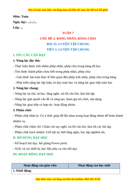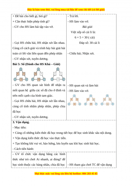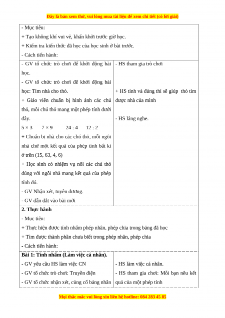 - Giải được bài toán thực tế liên quan đến phép tính nhân, phép chia trong bảng