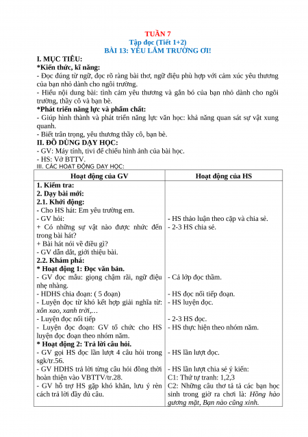 BÀI 13: YÊU LẮM TRƯỜNG ƠI! I. MỤC TIÊU: *Kiến thức, kĩ năng: