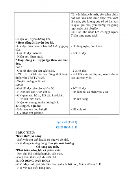 __________________________________________ Tập viết (Tiết 3) CHỮ HOA E, Ê I. MỤC TIÊU: *Kiến thức, kĩ năng: