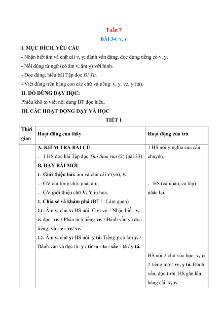 Tuần 7 BÀI 34: v, y I. MỤC ĐÍCH, YÊU CẰU