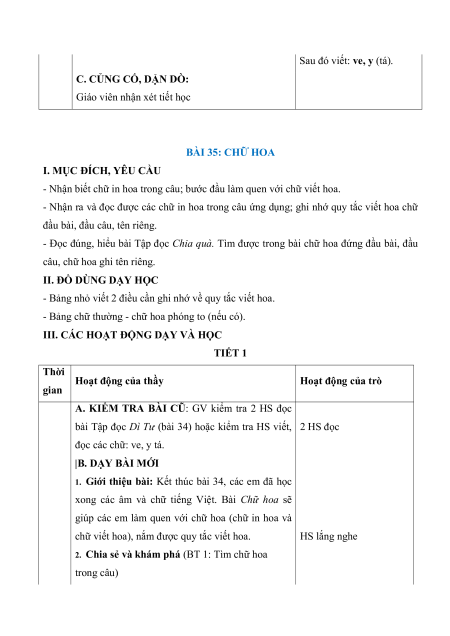 Giáo viên nhận xét tiết học BÀI 35: CHỮ HOA I. MỤC ĐÍCH, YÊU CẦU