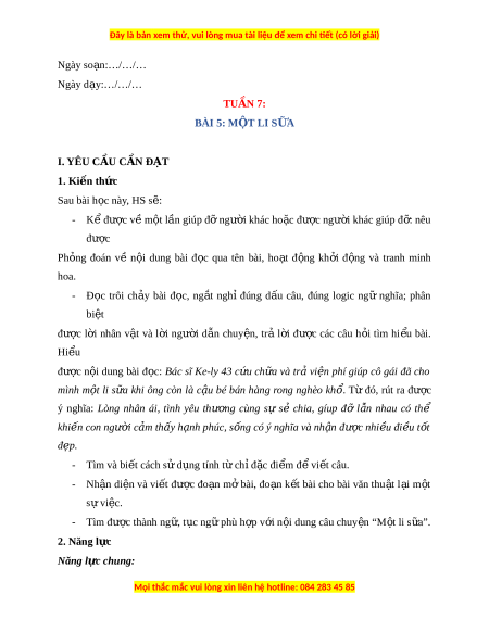 Ngày so n ạ :…/…/… Ngày d y ạ :…/…/… TUẦN 7: BÀI 5: M T Ộ LI S A Ữ I. YÊU C U Ầ C N Ầ Đ T Ạ 1. Ki n ế th c ứ Sau bài h c ọ này, HS s : ẽ - Kể đ c ượ v ề m t ộ l n ầ giúp đ ỡ ng i ườ khác ho c ặ đ c ượ ng i ườ khác giúp đ : ỡ nêu đ c ượ Ph n ỏ g đoán về n i ộ dung bài đ c ọ qua tên bài, ho t ạ đ n ộ g kh i ở đ n ộ g và tranh minh hoa. - Đ c ọ trôi ch y ả bài đ c, ọ ng t ắ nghỉ đúng d u ấ câu, đúng logic ng ữ nghĩa; phân biệt đ c ượ l i ờ nhân v t ậ và l i ờ ng i ườ d n ẫ chuy n ệ , trả l i ờ đ c ượ các câu h i ỏ tìm hi u ể bài. Hi u ể đ c ượ n i ộ dung bài đ c