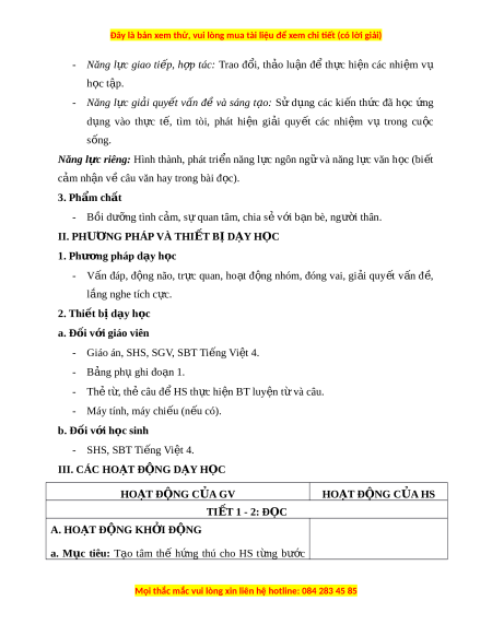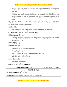 - Giáo án, SHS, SGV, SBT Ti n ế g Vi t ệ 4. - B n ả g ph ụ ghi đo n ạ 1. - Th ẻ t , ừ th ẻ câu đ ể HS th c ự hi n ệ BT luy n ệ t ừ và câu. - Máy tính, máy chi u ế (n u ế có). b. Đ i ố v i ớ h c ọ sinh - SHS, SBT Ti n ế g Vi t ệ 4. III. CÁC HO T Ạ Đ N Ộ G D Y Ạ H C Ọ HO T Ạ ĐỘNG C A Ủ GV HOẠT ĐỘNG C A Ủ HS TI T Ế 1 - 2: Đ C Ọ A. HO T Ạ Đ N Ộ G KH I Ở Đ N Ộ G a. M c ụ tiêu: T o ạ tâm thế h n ứ g thú cho HS t n ừ g b c ướ