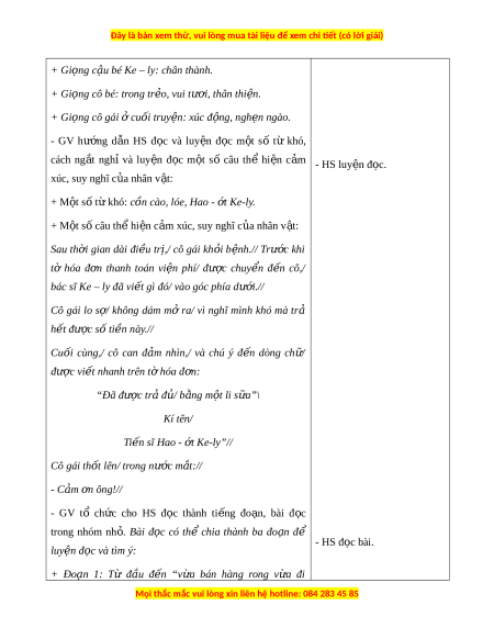 ả nhìn,/ và chú ý đ n ế dòng ch / ữ đ c ượ vi t ế nhanh trên t ờ hóa đ n ơ : “Đã đ c ượ tr ả đ / ủ b n ằ g m t ộ li s a ữ ”\ Kí tên/ Ti n ế sĩ Hao - t ớ Ke-ly”// Cô gái th t ố lên/ trong n c ướ m t ắ :// - C m ả n ơ ông!// - GV tổ ch c ứ cho HS đ c ọ thành ti n ế g đo n ạ , bài đ c ọ