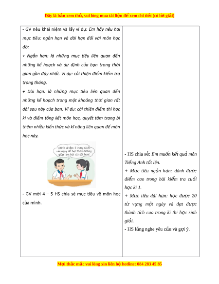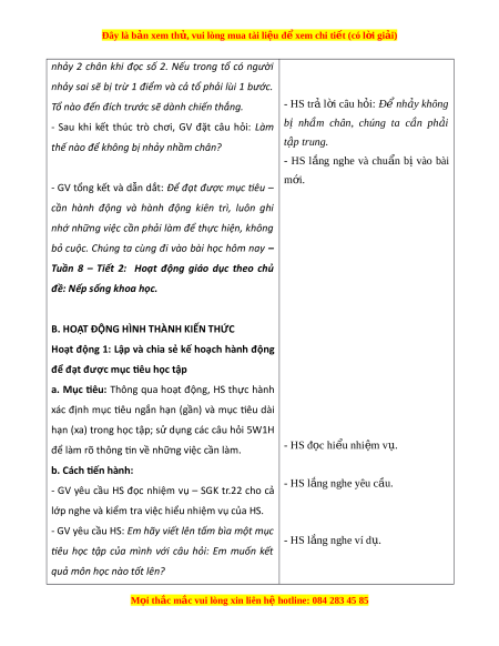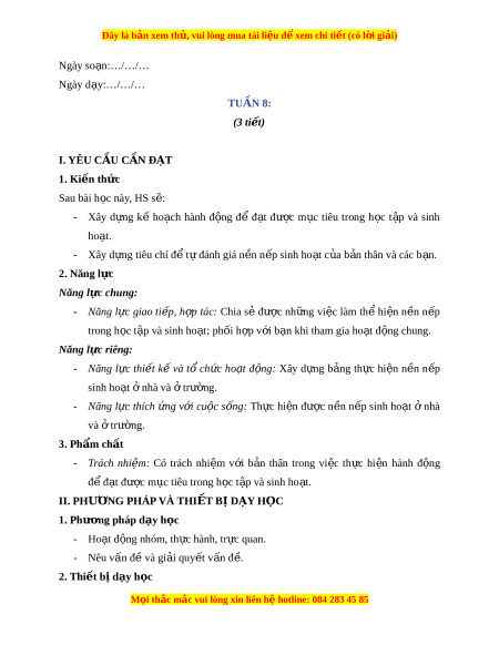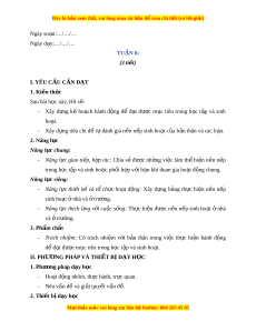 ệ đ xe ể m chi ti t ế (có l i ờ gi i ả ) Ngày so n ạ :…/…/… Ngày d y ạ :…/…/… TUẦN 8: (3 ti t ế ) I. YÊU C U Ầ C N Ầ Đ T Ạ 1. Ki n ế th c ứ Sau bài h c ọ này, HS s : ẽ - Xây d n ự g kế ho ch ạ hành đ n ộ g để đ t ạ đ c ượ m c ụ tiêu trong h c ọ t p ậ và sinh ho t ạ . - Xây d n ự g tiêu chí đ ể t ự đánh giá n n ề n p ế sinh ho t ạ c a ủ b n ả thân và các b n ạ . 2. Năng l c ự Năng l c ự chung: - Năng l c ự giao ti p ế , h p ợ tác: Chia sẻ đ c ượ nh n ữ g vi c ệ làm th ể hi n ệ n n ề n p ế trong h c ọ t p ậ và sinh ho t ạ ; phối h p ợ v i ớ b n ạ khi tham gia ho t ạ đ n ộ g chung. Năng l c ự riêng: - Năng l c ự thi t ế kế và tổ ch c ứ ho t ạ đ n ộ g: Xây d n ự g b n ả g th c ự hi n ệ n n ề n p ế sinh ho t ạ ở nhà và ở tr n ườ g. - Năng l c ự thích n ứ g v i ớ cu c ộ s n ố g: Th c ự hi n ệ đ c ượ n n ề n p ế sinh ho t ạ ở nhà và ở tr n ườ g. 3. Ph m ẩ ch t ấ - Trách nhi m ệ : Có trách nhi m ệ v i ớ b n ả thân trong vi c ệ th c ự hi n ệ hành đ n ộ g đ ể đ t ạ đ c ượ m c ụ tiêu trong h c ọ t p ậ và sinh ho t ạ .
