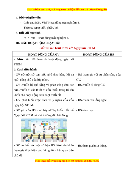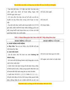 ệ đ xe ể m chi ti t ế (có l i ờ gi i ả ) a. Đ i ố v i ớ giáo viên - Giáo án, SGK, VBT Ho t ạ đ n ộ g tr i ả nghi m ệ 4. - Th ẻ t , ừ b n ả g vi t ế , ph n ấ , bút. b. Đ i ố v i ớ h c ọ sinh - SGK, VBT Ho t ạ đ n ộ g tr i ả nghi m ệ 4. III. CÁC HO T Ạ Đ N Ộ G D Y Ạ H C Ọ : Tiết 1: Sinh ho t ạ dư i ớ c : ờ Ngày h i ộ STEM HOẠT ĐỘNG C A Ủ GV HOẠT ĐỘNG C A Ủ HS a. M c