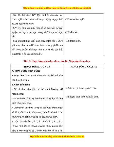 ầ : Em hãy chia sẻ về vi c ệ em đã rèn luy n ệ tư duy khoa h c ọ trong sinh ho t ạ và h c ọ - HS chia s . ẻ t p ậ . - Sau khi k t ế thúc bu i ổ sinh ho t ạ d i ướ c , ờ GVCN - HS th c ự hi n ệ . ghi nh , ớ nh c ắ nh ở HS th c ự hi n ệ nh n ữ g gì đã cam k t ế trong bu i ổ sinh ho t ạ hôm nay và báo cáo k t ế qu ả th c ự hi n ệ vào cu i ố tu n ầ . Tiết 2: Ho t ạ đ ng ộ giáo d c ụ theo ch ủ đ : ề N p ế s ng ố khoa h c ọ HOẠT ĐỘNG C A Ủ GV HOẠT ĐỘNG C A Ủ HS