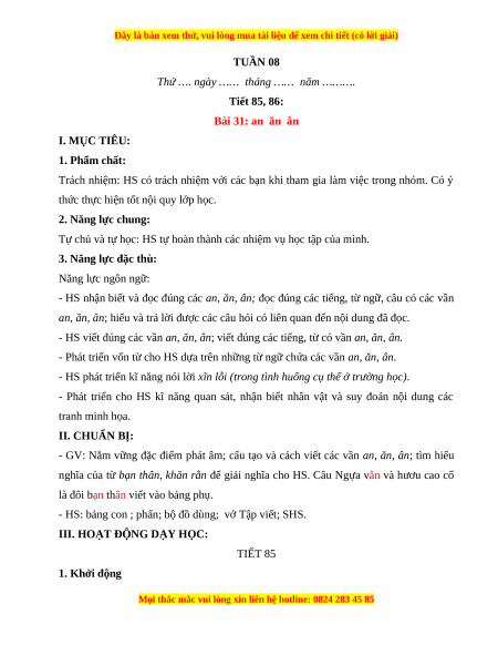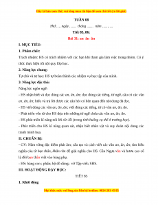 Thứ …. ngày …… tháng …… năm ………. Tiết 85, 86: Bài 31: an ăn ân I. MỤC TIÊU: 1. Phẩm chất: