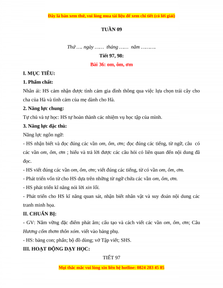 Thứ …. ngày …… tháng …… năm ………. Tiết 97, 98: Bài 36: om, ôm, ơm I. MỤC TIÊU: 1. Phẩm chất: