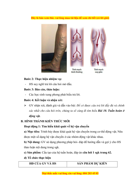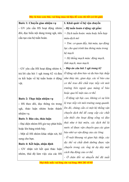 c) Sản phẩm: Cấu tạo của hệ tuần hoàn, đáp án câu hỏi 1 sgk trang 62. d) Tổ chức thực hiện HĐ CỦA GV VÀ HS SẢN PHẨM DỰ KIẾN