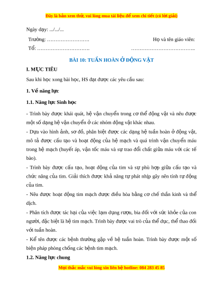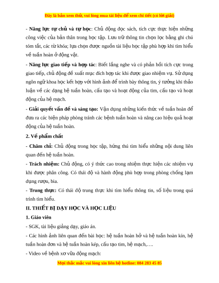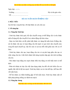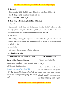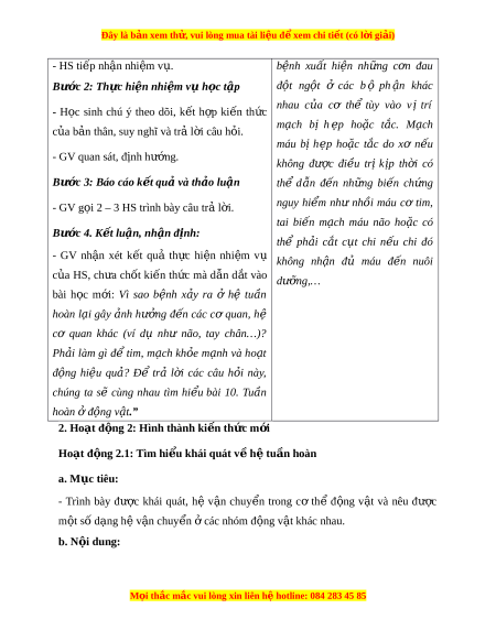 Đây là bản xem th , vu ử i lòng mua tài li u ệ đ xe ể m chi ti t (c ế ó l i ờ gi i ả ) 2. H c ọ sinh - Đ c và chu ọ n b â bài ị , tìm hi u t ể rư c t ớ hông tin v t ề u n hoàn ầ đ ở ng v ộ t ậ . - Các đồ dùng h c ọ t p khác t ậ heo yêu c u c ầ a G ủ V. III. TI N Ê TRÌNH D Y A H C O 1. Hoạt đ ng 1 ộ : Ho t ạ đ ng ộ kh i ở đ ng ( ộ M đ ở u) ầ a. Mục tiêu: - T o ạ tâm thế vui v , ẻ tho i ả mái cho h c ọ sinh, s n ẵ sàng tìm hi u ể ki n ế th c ứ m i ớ . Huy đ ng ộ đư c ợ nh ng ữ ki n ế th c ứ kĩ năng kinh nghi m ệ c a ủ b n ả thân có liên quan đ n bài ế h c m ọ i ớ , kích thích mong mu n t ố ìm hi u bài ể h c m ọ i ớ . b. N i ộ dung: - GV sử d ng ụ phư ng ơ pháp tr c ự quan và kĩ thu t ậ h i ỏ đáp, yêu c u ầ HS quan sát video và đ t ặ v n ấ đ : ề M ch a mau b ih p e ho c ă t c ă do xơ v a ư co th ê gây h u â qua gi đôi v i ơ cơ th ? ê c. Sản phẩm: - Các câu trả l i ờ c a ủ HS (có th đúng ho ể c ặ sai). d. T ch ổ ức thực hi n: ệ Hoạt đ ng c ộ a gi ủ áo viên và h c s ọ inh N i ộ dung ki n t ế h c ứ Bư c ớ 1. Chuy n gi ể ao nhi m ệ v : ụ - Các câu trả l i ờ c a ủ HS: - Giáo viên yêu c u ầ h c