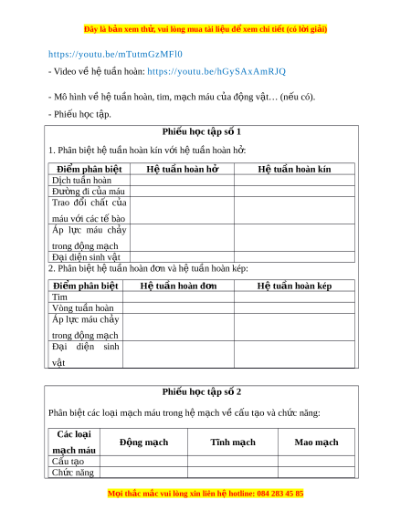 ề ệ tuần hoàn: https://youtu.be/hGySAxAmRJQ - Mô hình v h ề ệ tu n hoàn, t ầ im, m ch m ạ áu c a đ ủ ng v ộ t ậ … (n u có) ế . - Phi u h ế c t ọ p. ậ Phi u h ế c t ọ p s ậ 1 ố 1. Phân bi t ệ h t ệ u n hoàn ầ kín v i ớ h t ệ u n hoàn h ầ : ở Đi m ể phân bi t ệ H t ệ uần hoàn hở H t ệ uần hoàn kín Dịch tuần hoàn Đư ng ờ đi c a ủ máu Trao đổi ch t ấ c a ủ máu v i ớ các t bào ế Áp l c ự máu ch y ả trong đ ng m ộ ch ạ Đ i ạ di n s ệ inh v t ậ