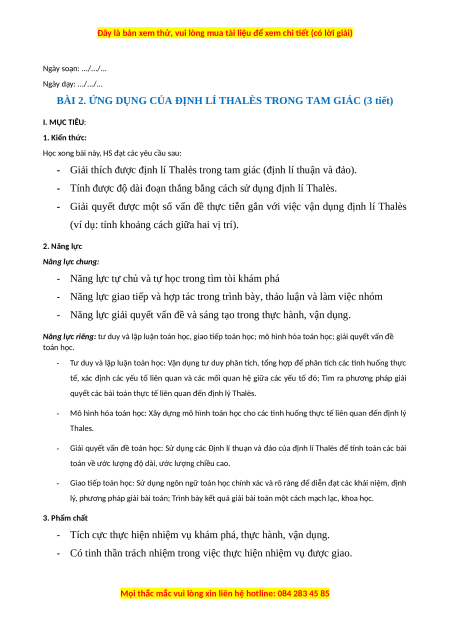 BÀI 2. ỨNG DỤNG CỦA ĐỊNH LÍ THALÈS TRONG TAM GIÁC (3 tiết) I. MỤC TIÊU: