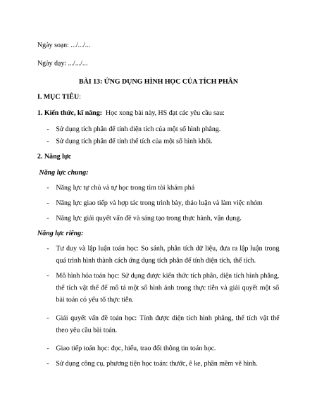 BÀI 13: ỨNG DỤNG HÌNH HỌC CỦA TÍCH PHÂN I. MỤC TIÊU: