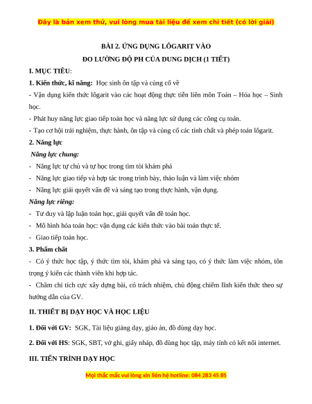 Giáo án Ứng dụng lôgarit vào đo lường độ pH của dung dịch Toán 11 Chân trời sáng tạo