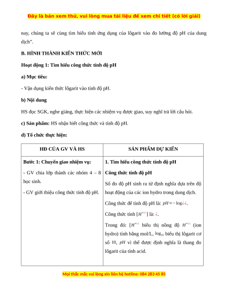Hoạt động 1: Tìm hiểu công thức tính độ pH a) Mục tiêu: