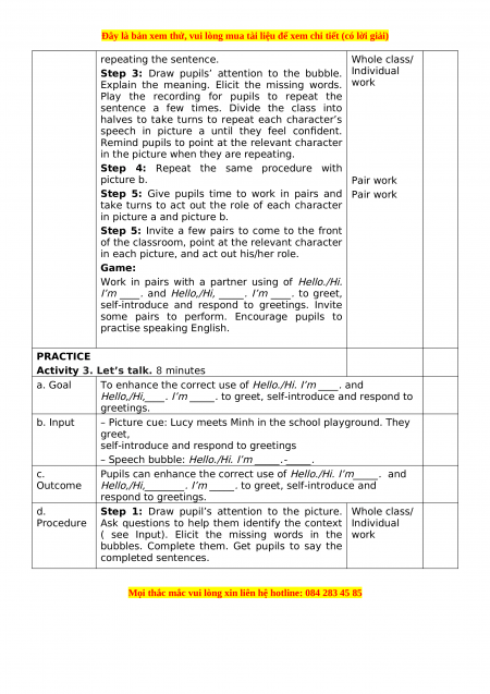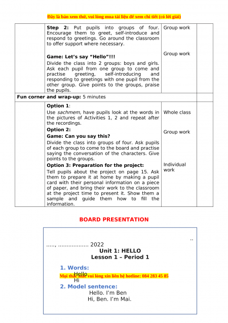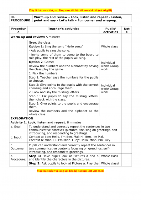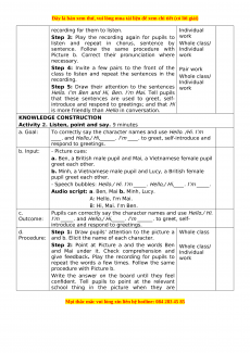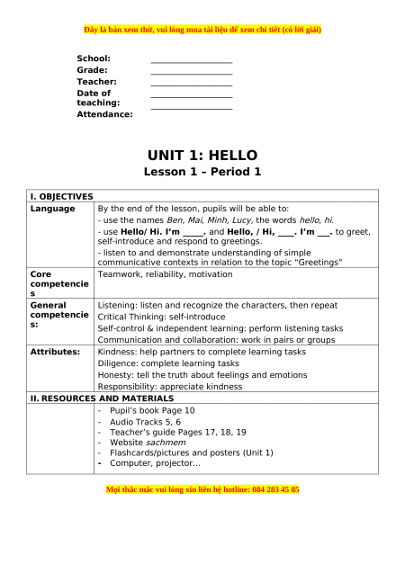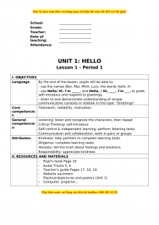 School: ____________________ Grade: ____________________ Teacher: ____________________ Date of ____________________ teaching: ____________________ Attendance: UNIT 1: HELLO Lesson 1 – Period 1 I. OBJECTIVES Language
