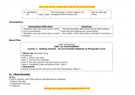 - Students may not know how to work - Give short, clear instructions and help if necessary. in teams. Board Plan Date of teaching UNIT 10: ECOTOURISM