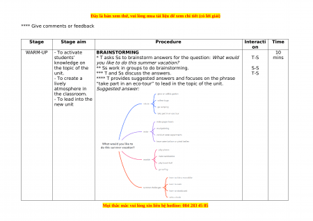 **** Give comments or feedback Stage Stage aim Procedure Interacti Time on WARM-UP - To activate BRAINSTORMING 10 students’