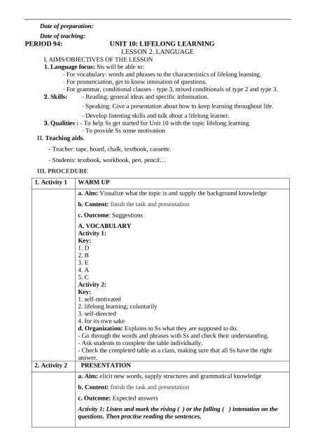 - Call on some sts to give answers. - Corrects and gives feedback. Date of preparation: Date of teaching: PERIOD 94: