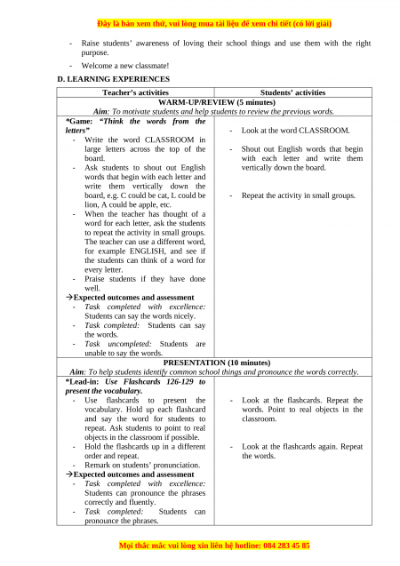 Raise students’ awareness of loving their school things and use them with the right purpose. - Welcome a new classmate! D. LEARNING EXPERIENCES Teacher’s activities Students’ activities