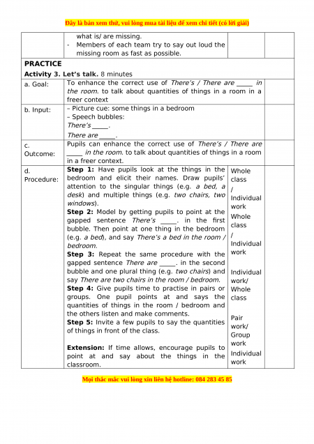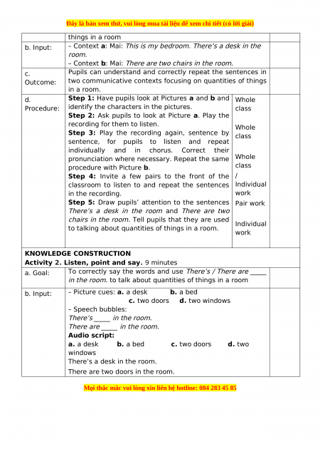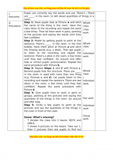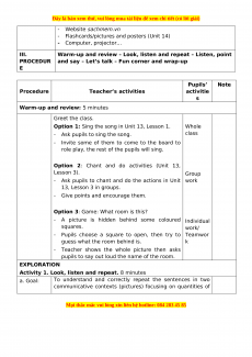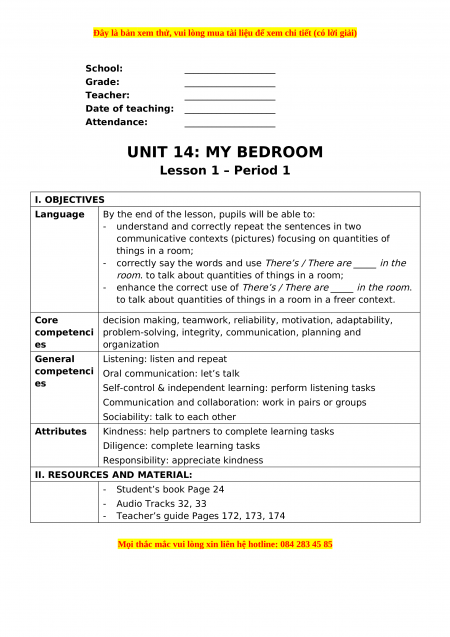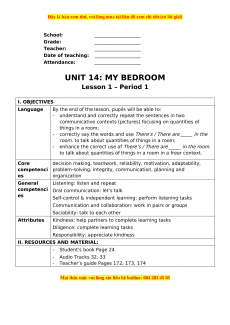 School: ____________________ Grade: ____________________ Teacher: ____________________ Date of teaching: ____________________ Attendance: ____________________ UNIT 14: MY BEDROOM Lesson 1 – Period 1 I. OBJECTIVES Language