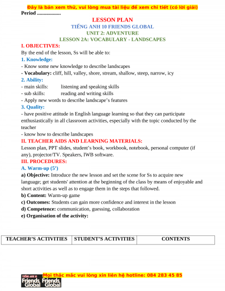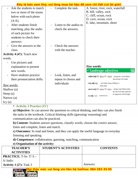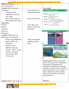 Activity 1 (4’): Teach new New words: vocabulary. - Some students will - Use pictures and answer the question. explanation to present new words. - Have students practice - Listen to the teacher. their pronunciation drills. New words: Cliff (n) - Look, listen, and Hill (n) repeat in chorus and Valley (n) individuals Shore (n) Stream (n)