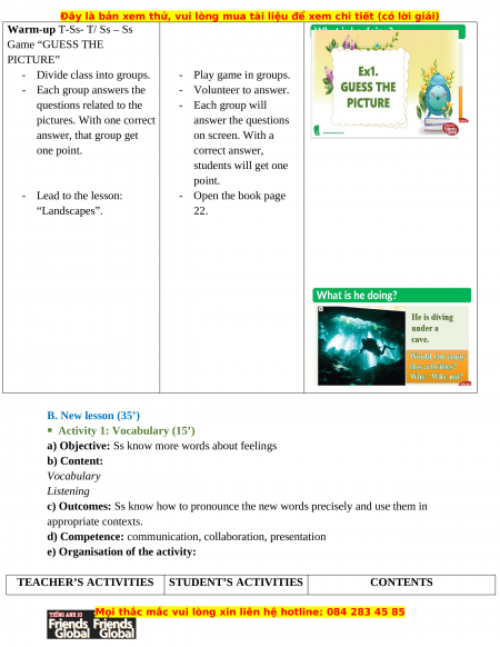 Warm-up T-Ss- T/ Ss – Ss Game “GUESS THE PICTURE” - Divide class into groups. - Play game in groups. - Each group answers the - Volunteer to answer. questions related to the - Each group will pictures. With one correct answer the questions answer, that group get on screen. With a one point. correct answer, students will get one point. - Lead to the lesson: - Open the book page “Landscapes”. 22. B. New lesson (35’)