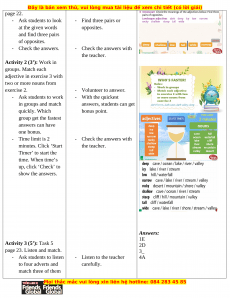 A. forest, river, rock, waterfall two or more of the nouns B. hill, valley, rock below with each photo C. cliff, ocean, rock (A-E). D. cave, ocean, rock E. lake, mountain, shore - After students finish - Listen to the audios to matching, play the audio check the answers. of each picture for students to check their answers. - Give the answers to the - Check the answers class. with the teacher.