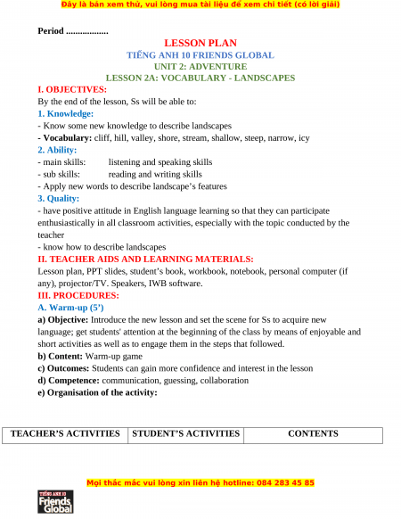 Giáo án Unit 2: Adventure Tiếng Anh 10 Friends global