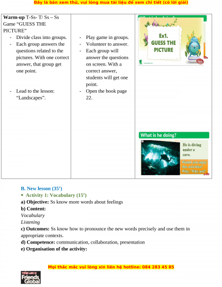 Warm-up T-Ss- T/ Ss – Ss Game “GUESS THE PICTURE” - Divide class into groups. - Play game in groups. - Each group answers the - Volunteer to answer. questions related to the - Each group will pictures. With one correct answer the questions answer, that group get on screen. With a one point. correct answer, students will get one point. - Lead to the lesson: - Open the book page “Landscapes”. 22. B. New lesson (35’)