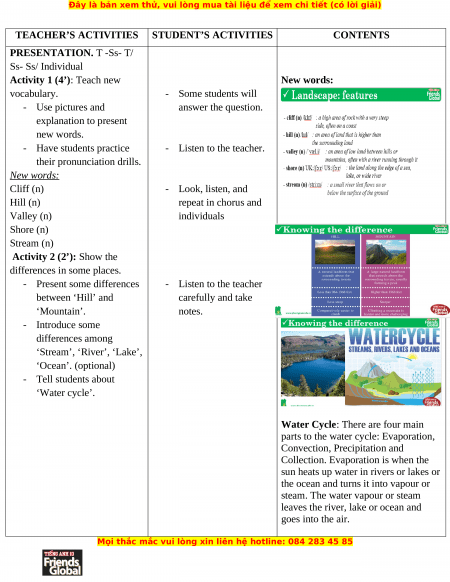 Activity 1 (4’): Teach new New words: vocabulary. - Some students will - Use pictures and answer the question. explanation to present new words. - Have students practice - Listen to the teacher. their pronunciation drills. New words: Cliff (n) - Look, listen, and Hill (n) repeat in chorus and Valley (n) individuals Shore (n) Stream (n)