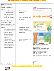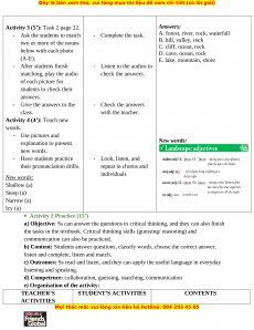 A. forest, river, rock, waterfall two or more of the nouns B. hill, valley, rock C. cliff, ocean, rock below with each photo D. cave, ocean, rock (A-E). E. lake, mountain, shore - After students finish - Listen to the audios to matching, play the audio check the answers. of each picture for students to check their answers. - Give the answers to the - Check the answers class. with the teacher.