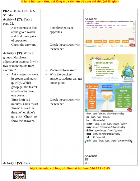 Activity 4 (4’): Teach new words. - Use pictures and explanation to present New words: new words. - Have students practice - Look, listen, and their pronunciation drills. repeat in chorus and individuals New words: Shallow (a) Steep (a) Narrow (a) Icy (a)