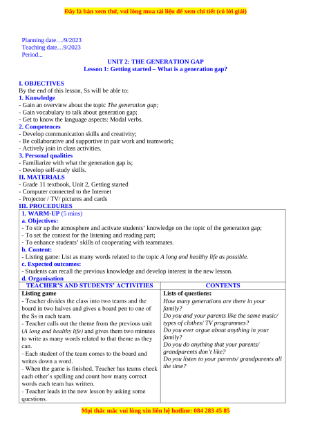 Lesson 1: Getting started – What is a generation gap? I. OBJECTIVES