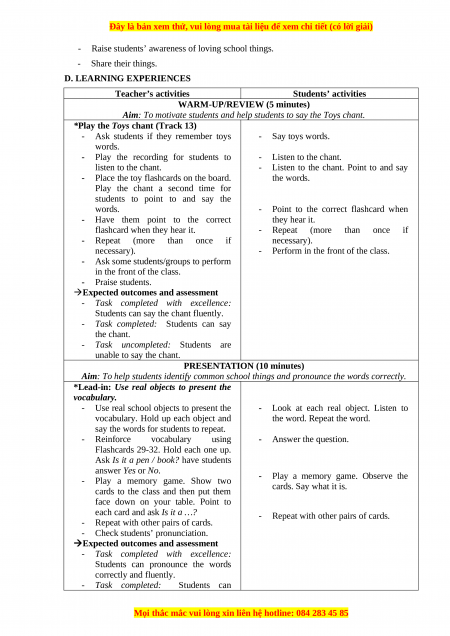 Raise students’ awareness of loving school things. - Share their things. D. LEARNING EXPERIENCES Teacher’s activities Students’ activities