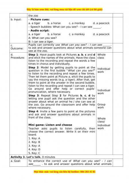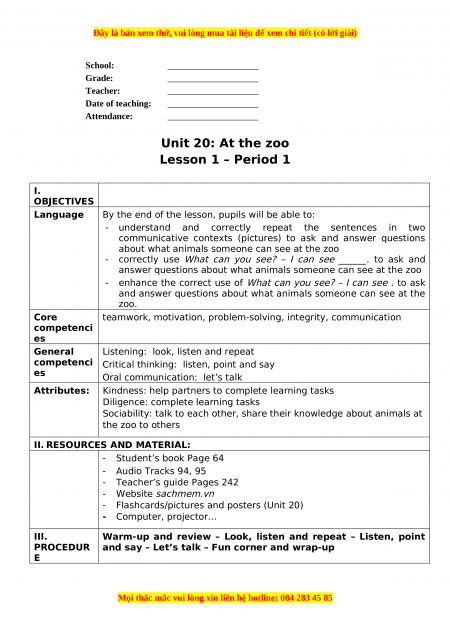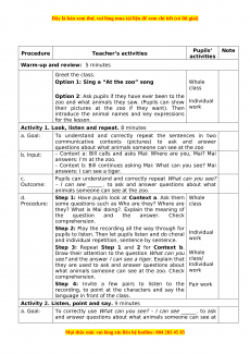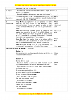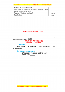 School: ____________________ Grade: ____________________ Teacher: ____________________ Date of teaching: ____________________ Attendance: ____________________ Unit 20: At the zoo Lesson 1 – Period 1 I. OBJECTIVES Language