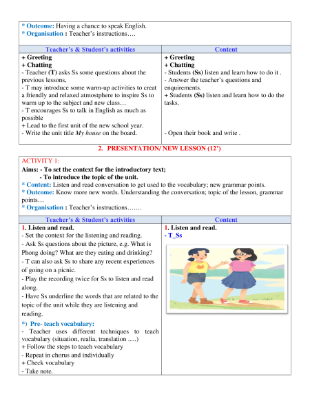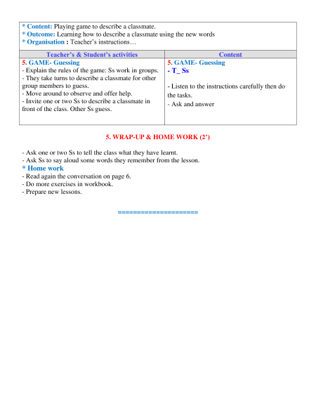 * Outcome: Know more new words. Understanding the conversation; topic of the lesson, grammar points…