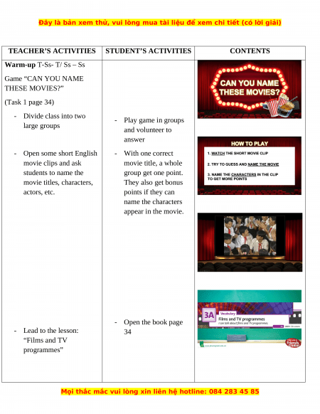 Warm-up T-Ss- T/ Ss – Ss Game “CAN YOU NAME THESE MOVIES?” (Task 1 page 34) - Divide class into two - Play game in groups large groups and volunteer to answer - Open some short English - With one correct movie clips and ask movie title, a whole students to name the group get one point. movie titles, characters, They also get bonus actors, etc. points if they can name the characters appear in the movie. - Open the book page - Lead to the lesson: 34 “Films and TV programmes”